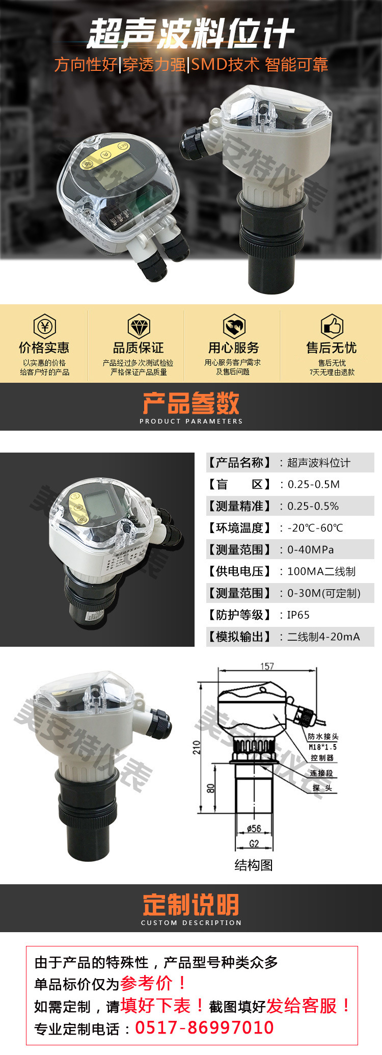 价格低,体积小,重量轻,可用于食品,化工,半导体等行业对液体和散装固体非接解式物位测量,可用于远程物位监控和泵的控制。